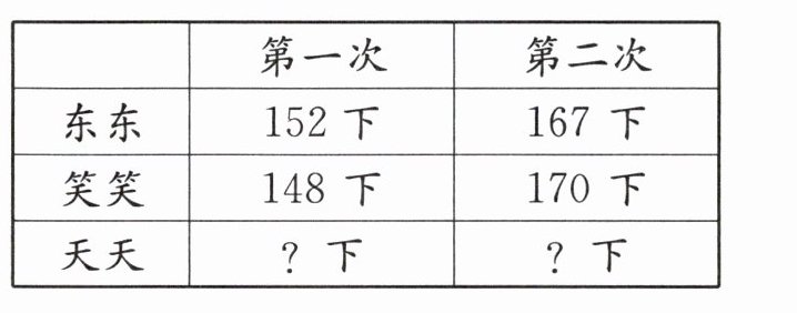 第一次是第一名,至少比第二名多1下。已知东东第一次152下,笑笑第一次148下,所以天天第一次至少跳$152 + 1 = 153$下。