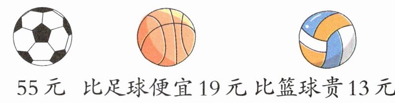 (2)一个排球的价钱 55 - 19 + 13 = 49(元) 一个足球和一个排球一共的价钱 55 + 49 = 104(元)