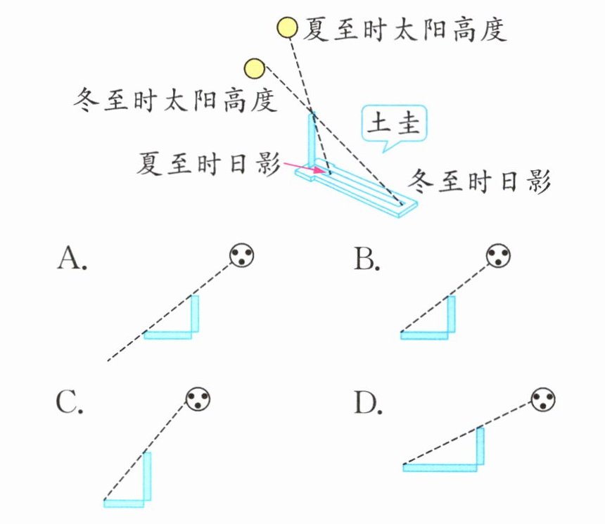 3. 新情境 知识科普 土圭是一种古老的测量日影长短的工具,通过观察记录它正午时影子的长短变化来确定季节的变化。2025年12月21日是冬至,请根据如图冬至与夏至的影长,判断这一天正午物体的影子最可能是下面图中的(