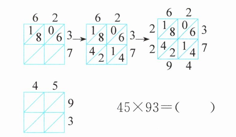 6. 新情境 数学文化 下面是用“铺地锦”方法计算$62×37=2294$的过程。请你仿照例子填一填。
