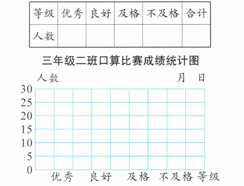 )人。(2) 规定85分及以上为优秀,75~84分为良好,60~74分为及格,60分以下为不及格。根据上面数据完成统计表和条形统计图。