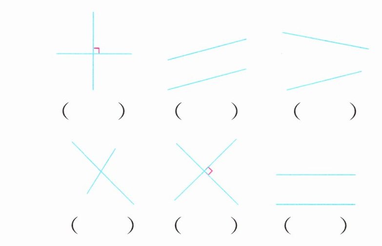 1. 下面图形中,两条直线互相平行的,在括号里画“□”,互相垂直的画“△”,既不平行也不垂直的画“×”。