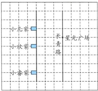 3. (2025·苏州常熟市期末)如图,小凡家、小欣家和小睿家的三个小区都在同一条直线上,市政管理局为了改善居民的居住环境和出行条件,准备修一条长青路,而且星光广场就在长青路上。若这三个小区到长青路的距离都相等,应该怎样修建?在图中画一画。