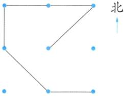 3. 亮点原创·妈妈的手机锁屏密码是从最中间的点开始,先向东北连1个点,然后向西连2个点,再向南连1个点,接着向东南连1个点,最后向东连1个点。请你在图中连一连。