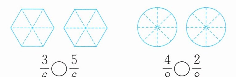 $\frac{3}{6} ◯ \frac{5}{6}$ $\frac{4}{8} ◯ \frac{2}{8}$