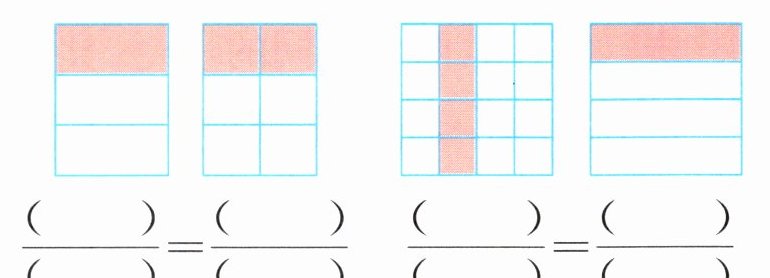 2. 先在图中涂色表示已知分数的等值分数,再填一填。