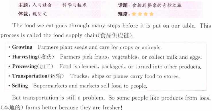 because the products are fresher.答案:(一)1. T 解析 根据材料中“Growing”“Harvesting”“Processing”“Transportation”和“Selling”可知,食品供应链包含 5 个环节。故填 T。