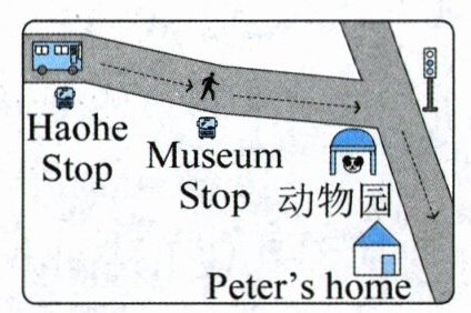 彼得:你可以乘坐5路公交车。你可以在濠河站上车,在博物馆站下车。然后,沿着街道走,在交通灯处右转。你会看到一个动物园。我家就在它旁边。