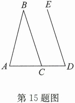 15. 如图,点 $ D $在$ △ ABC $的边 $ AC $的延长线上,$ BC // DE $. 若$ ∠ B = 32^{\circ} $,$ ∠ D = 72^{\circ} $,则$ ∠ A $的度数是