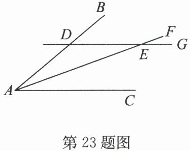23.(6 分)(2024·宿豫区期末)如图,点 $ D $在 $ AB $上,直线 $ DG $交 $ AF $于点 $ E $. 请从①$ DG // AC $;②$ AF $平分$ ∠ BAC $;③$ ∠ DAE = ∠ DEA $中任选两个作为条件,余下一个作为结论,构造一个真命题,并求证.