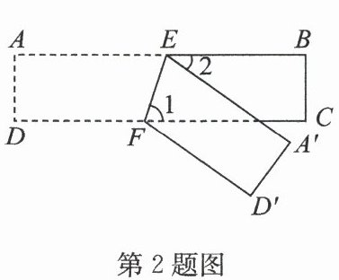 2. (2024·工业园区期中)如图,$ ABCD $ 为一长条形纸带,$ AB // CD $,将 $ ABCD $ 沿 $ EF $ 折叠,$ A $,$ D $ 两点分别与点 $ A' $,$ D' $ 对应. 若 $ ∠ 1 = ∠ 2 $,则 $ ∠ AEF $ 的度数为(