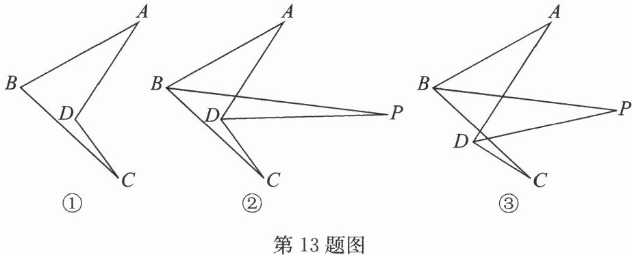 13. 解:(1)如答图①,延长 $AD$ 交 $BC$ 于点 $E$. 在 $△ ABE$ 中,$∠ AEC=∠ A+∠ B = 28^{\circ}+72^{\circ}=100^{\circ}$,在 $△ DEC$ 中,$∠ ADC=∠ AEC+∠ C = 100^{\circ}+11^{\circ}=111^{\circ}$.