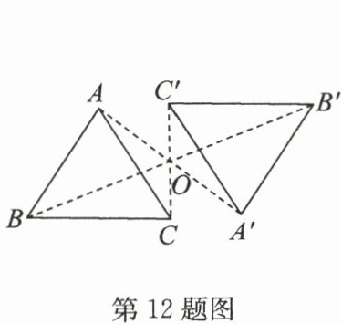 12. 如图,$△ A'B'C'$ 由 $△ ABC$ 绕点 $O$ 旋转 $180^{\circ}$ 而得到,有下列结论:①点 $A$ 与点 $A'$ 是对应点;② $BO = B'O$;③ $∠ ACB = ∠ C'A'B'$;④ $AB = A'B'$. 其中成立的是