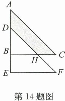 14. 如图,将直角 $△ ABC$ 沿 $AB$ 方向平移 $2cm$ 得到 $△ DEF$,$DF$ 交 $BC$ 于点 $H$,$CH = 2cm$,$EF = 5cm$,则阴影部分的面积为