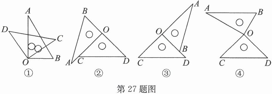 27. (12 分)在数学实践活动课上,小亮同学利用一副三角尺探索与研究共直角顶点的两个直角三角形中的位置关系与数量关系. (其中$∠ A = 30^{\circ}$,$∠ B = 60^{\circ}$,$∠ C = ∠ D = 45^{\circ}$)