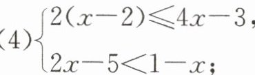 (4) $\begin{cases}2(x - 2)≤ 4x - 3, \\ 2x - 5 < 1 - x;\end{cases}$