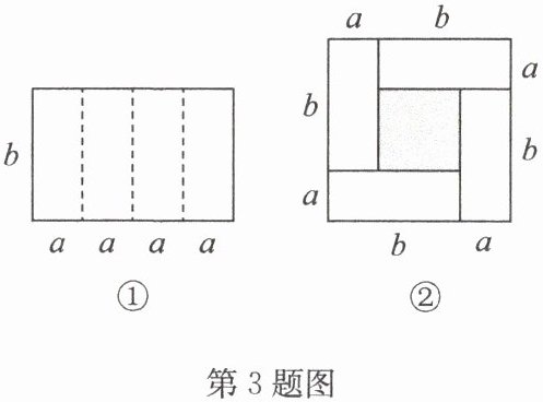 3. 如图①是长为4a,宽为b的长方形纸片,沿图中虚线用剪刀平均裁成四块小长方形,然后将四块小长方形拼成一个“回形”正方形,如图②.