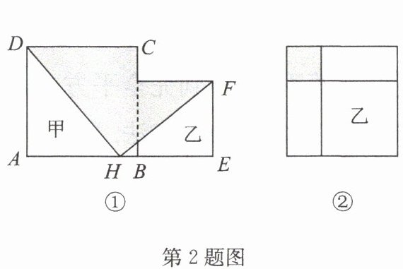 2. 现有甲、乙两张正方形纸片,将甲、乙并列放置后得到图①,H 为 AE 的中点,连接DH,FH. 将乙纸片放到甲纸片的内部得到图②. 已知甲、乙两个正方形边长之和为 8,图②中阴影部分的面积为 6,则图①中阴影部分的面积为