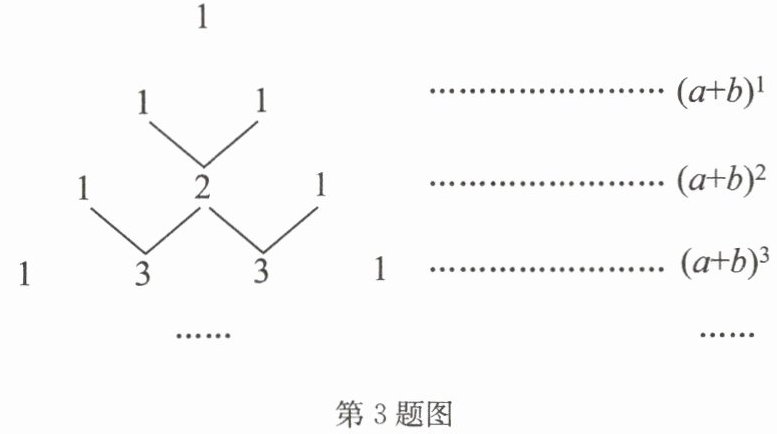 3. 我国古代数学的许多发现都曾位居世界前列,“杨辉三角”就是其中一例,如图所示为这个“三角形”的构造法则:两腰上的数都是$1$,其余每个数均为其上方左右两数之和,它给出了$(a + b)^{n}$($n$为正整数)的展开式(按$a$的次数由大到小的顺序排列)的系数规律。例如,在“三角形”中,第三行的三个数$1$,$2$,$1$,恰好对应$(a + b)^{2}=a^{2}+2ab + b^{2}$展开式中的系数;第四行的四个数$1$,$3$,$3$,$1$,恰好对应$(a + b)^{3}=a^{3}+3a^{2}b + 3ab^{2}+b^{3}$展开式中的系数。