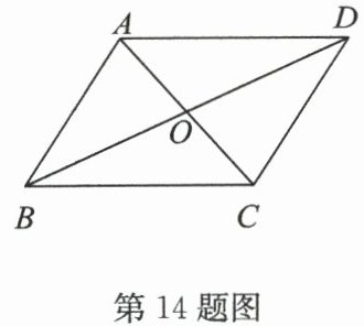 14. 如图,已知 $□ ABCD$ 的对角线 $AC$,$BD$ 相交于点 $O$,其周长为 16,且 $△ AOB$ 的周长比 $△ BOC$ 的周长小 2,则 $AB$ 的长为