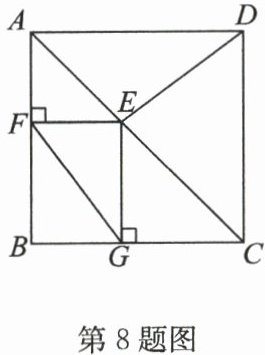 8. 如图,在正方形 $ABCD$ 中,$AB=4$,$E$ 为对角线 $AC$ 上的一个动点(不与点 $A$,$C$ 重合),过点 $E$ 作 $EF⊥ AB$ 于点 $F$,$EG⊥ BC$ 于点 $G$,连接 $DE$,$FG$。给出下列结论:①$DE=FG$;②$∠ FGB=∠ EDC$;③$DE=AE$ 时,四边形 $BFEG$ 是正方形;④$DE+FG$ 的最小值为 8。其中正确的结论有(