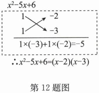 12.(2025·黄山期末)对于二次三项式$x^{2} + mx + n$,如果能将常数项$n$分解成两个因数$a$,$b$,使$a$,$b$的和恰好等于一次项系数$m$,即$ab = n$,$a + b = m$,就能将$x^{2} + mx + n$分解因式。这种分解因式的方法取名为“十字相乘法”。为使分解过程直观,常常采用图示的方法,将二次项系数与常数项的因数分成两列(如图),再交叉相乘并求和,检验是否等于一次项系数,进而进行因式分解。代数式$x^{2} + 6x - 16$因式分解的结果为