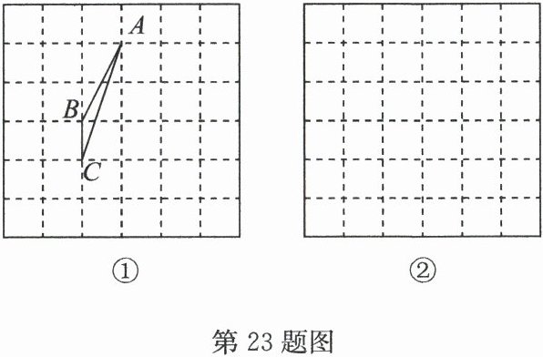 23. 通过学习,同学们发现在正方形网格中,构造某些图形可以发现和解决一些数学问题。例如:如图①,在正方形网格中(每个小正方形的边长都为1)构造$△ ABC$,比较$\sqrt{5} + 1$与$\sqrt{10}$的大小。其解答过程如下:因为点$A$,$B$,$C$都为小正方形的顶点,小正方形的边长为1,所以$AB = \sqrt{2^2 + 1^2} = \sqrt{5}$,$AC = \sqrt{3^2 + 1^2} = \sqrt{10}$,$BC = 1$,因为在$△ ABC$中,$AB + BC > AC$(三角形任意两边之和大于第三边),所以$\sqrt{5} + 1 > \sqrt{10}$。