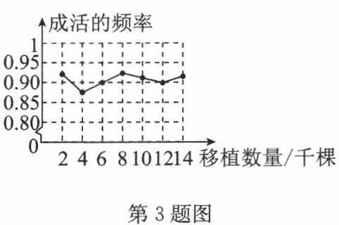 3. (2025 春·宿豫区期末)今年植树节,某社区集中移栽了一批香樟树.该社区调查了这批香樟树移栽成活情况,得到如图所示的统计图,由此可估计这批香樟树移栽成活的概率约为(