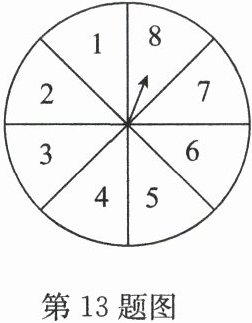 13. (10 分)如图,转盘被平均分成 8 个区域,每个区域分别标注数字 1,2,3,4,5,6,7,8,任意转动转盘一次,规定:如果指针恰好指在分割线上,那么重转一次,直到指针指向某个标有数字的区域为止. 写出下列事件发生的概率:①$P$(指针落在标有 7 的区域)$=$