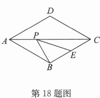 18. 如图,在菱形$ABCD$中,$AD=2$,$∠ ABC=120^{\circ}$,$E$是$BC$的中点,$P$为对角线$AC$上的一个动点,则$PE+PB$的最小值为