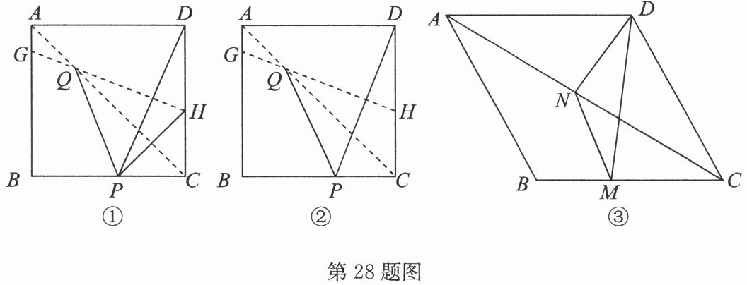 28. (1)① $22.5^{\circ} $ 点拨:如答图①,设 PH 交 AC 于点 I. 在正方形 ABCD 中, $ AD = CD = BC = AB = 8 $, $ ∠ BCD = 90^{\circ} $,
