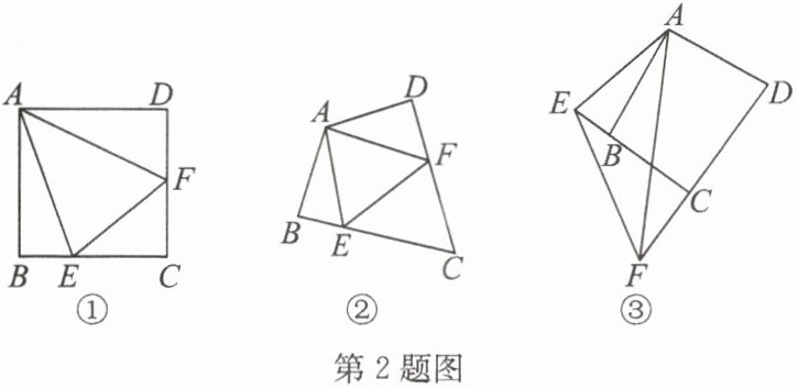 2. (1) $ EF = BE + DF $ 点拨:如答图①,将 $ △ ADF $ 绕点 $ A $ 顺时针旋转 $ 90 ^ { \circ } $ 得到 $ △ ABG $,