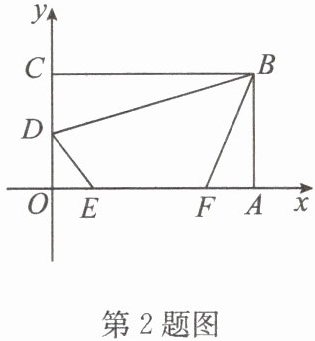 2. 如图,在平面直角坐标系中,四边形 $ OABC $ 为矩形,点 $ A $ 在 $ x $ 轴的正半轴上,点 $ C $ 在 $ y $ 轴的正半轴上,且 $ OA = 6 $,$ OC = 4 $,$ D $ 为 $ OC $ 的中点,点 $ E $,$ F $ 在线段 $ OA $ 上,点 $ E $ 在点 $ F $ 的左侧,$ EF = 2 $。当四边形 $ BDEF $ 的周长最小时,点 $ E $ 的坐标是(