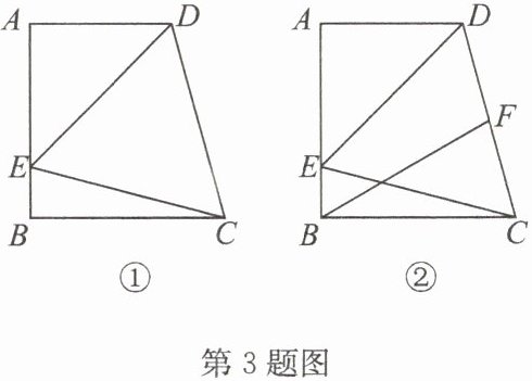 3. 如图①,在直角梯形 $ABCD$ 中,$AD // BC$,$AB ⊥ BC$,$∠ DCB = 75^{\circ}$,以 $CD$ 为一边的等边三角形 $DCE$ 的另一顶点 $E$ 在腰 $AB$ 上.