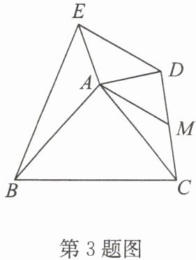 3. 如图,在$△ ABC$和$△ ADE$中,$AB = AC,AD = AE,∠BAC + ∠DAE = 180^{\circ}$,连接 BE,CD,若 AM 为$△ ACD$的中线,猜想 AM 与 BE 的数量关系并说明理由.