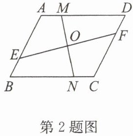 2. 如图,在平行四边形 ABCD 中,$AB = 6,BC = 8$,线段 EF 与线段 MN 分别过平行四边形 ABCD 的对称中心 O,且将平行四边形 ABCD 分成面积相等的四部分. 若$AM = 2$,则$BE =$