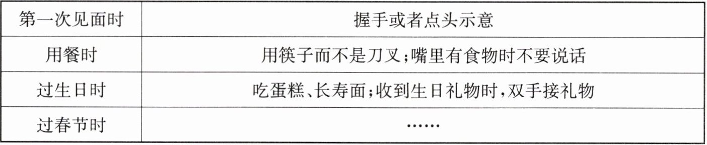 首先,当我们中国人初次见面时,我们会握手或者点头示意。其次,我们使用筷子而不是刀叉。嘴里有食物的时候不要说话。