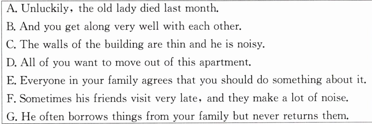 这个孙子大约二十岁。他给你的家人带来了麻烦。C 这栋楼的墙很薄,而且他很吵闹。你们习惯了生活在宁静的环境中,但这个孙子喜欢在深夜听收音机。F 有时他的朋友来得很晚,而且他们制造很多噪音。