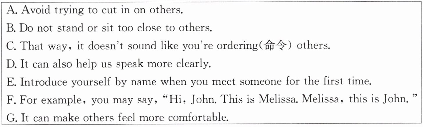 F. 例如,你可以说:“嗨,约翰。这是梅利莎。梅利莎,这是约翰。”