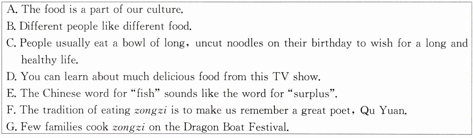 你是一个美食爱好者吗?你知道《舌尖上的中国》这个电视节目吗?D 你可以从这个电视节目中了解到很多美味的食物。人们通常在特殊的日子吃一些传统食物。A 食物是我们文化的一部分。这里有一些中国传统食物。