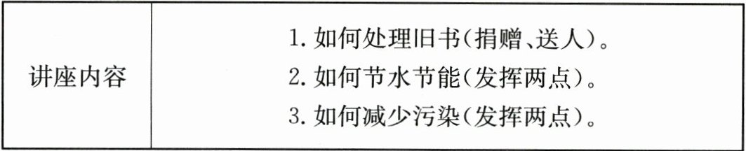 答案:One possible version: Last Friday, our school held a talk on the green lifestyle in the school hall. First, the speaker introduced several ways to deal with old books. For example, it is a good idea to donate them to the children in poor areas. And we can also give them to our friends who are interested in them. Then, some advice was given on how to save water and energy. For example, we should turn off the tap after washing hands. It's also important for us to turn off the lights when we leave a room. Finally, we were taught some useful ways to reduce pollution, such as going to school by bus and using our own bags while shopping. We hope the talk can help more people realize the importance of the green lifestyle and take action right away!