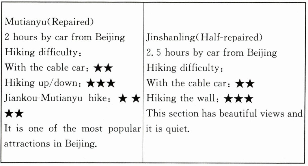 2. B 【点拨】根据“Jiankou-Mutianyu hike:★★★★”可知选 B。