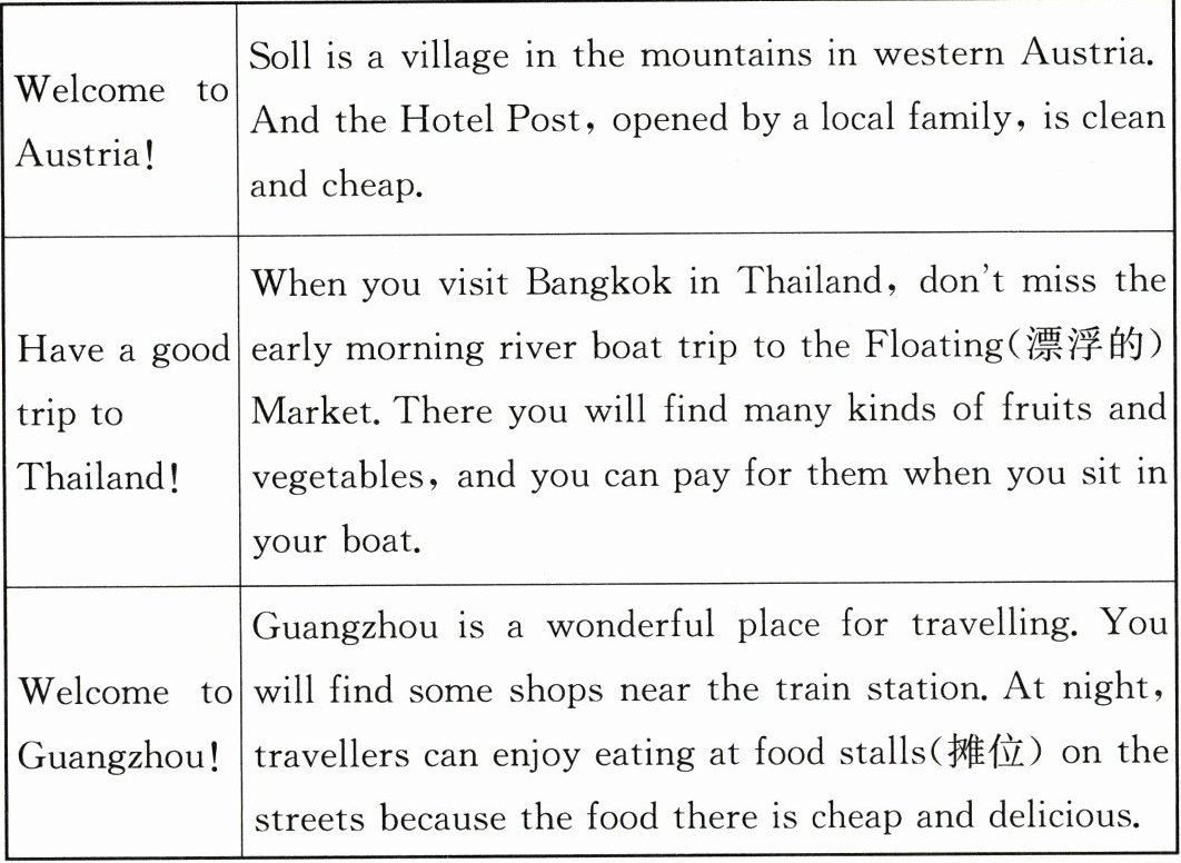 3. C 【点拨】根据“Guangzhou is a wonderful place for travelling...At night, travellers can enjoy eating at food stalls(摊位)on the streets”可知,在广州晚上可以享受街头美食。故选 C。