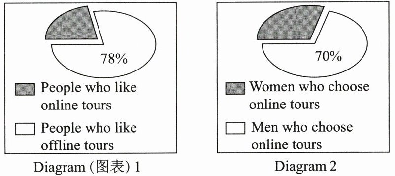 From the first diagram, we found that 78% of the people like offline tours. They think they can see, hear, smell and touch things. They can also meet new and different people and try all kinds of local food. What's more, they think that it's meaningful to read ten thousand books and travel ten thousand miles.
