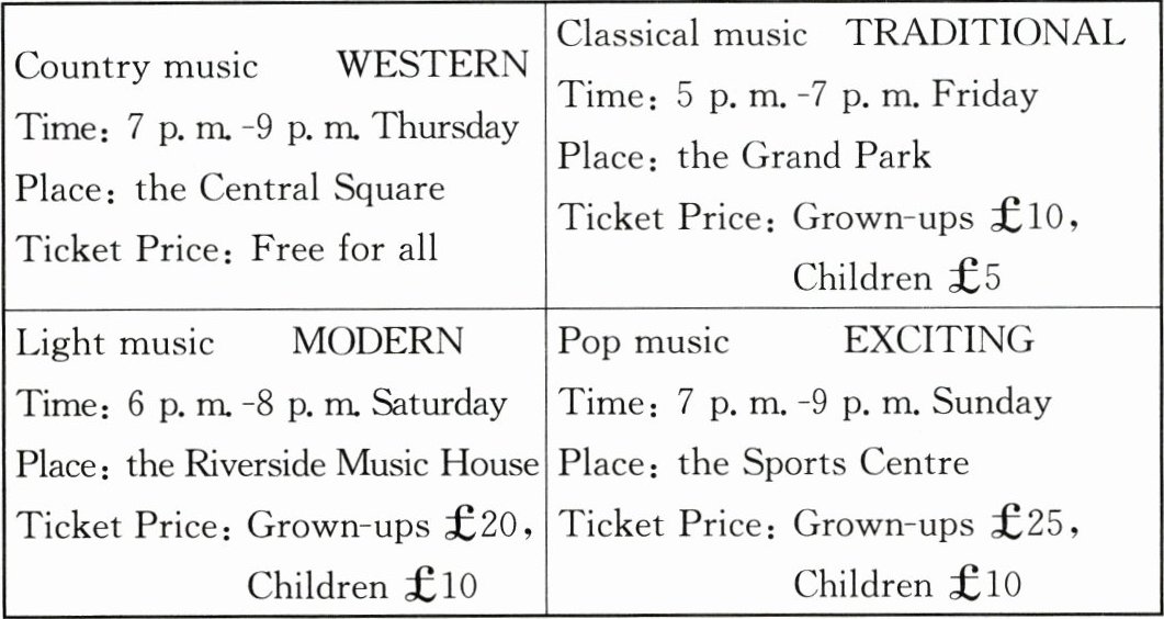 2. B 【点拨】根据“Classical music”中的“Ticket Price:Grown - ups £10,Children £5”可知,古典音乐会成年人票价是 10 英镑,儿童是 5 英镑,布莱特太太带着两个孩子,共需要支付 20 英镑。故选 B。