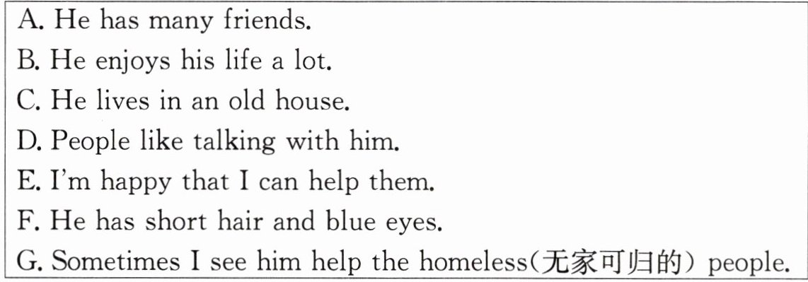 G. Sometimes I see him help the homeless (无家可归的) people.