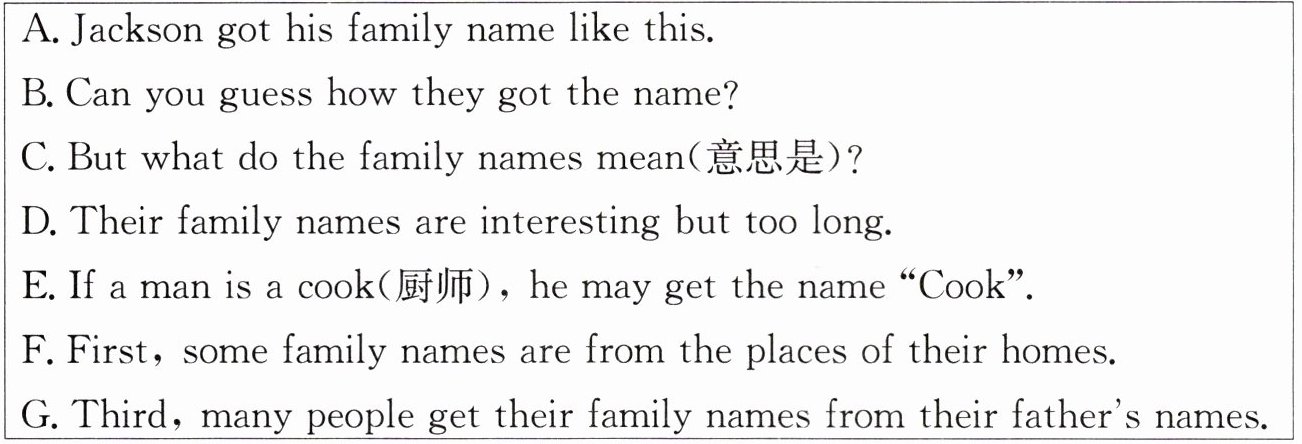 2 If a man lives near a hill, his family name may be Hill. In England, some people’s family name is Lake. 3 Yes, their ancestors(祖先) lived near a lake. Second, some family names are from a person’s job. 4 James Cook was the first Englishman to get to Australia. His family got the name in this way. 5 If you hear the family name “Jackson”, you know that he is the son of Jack.