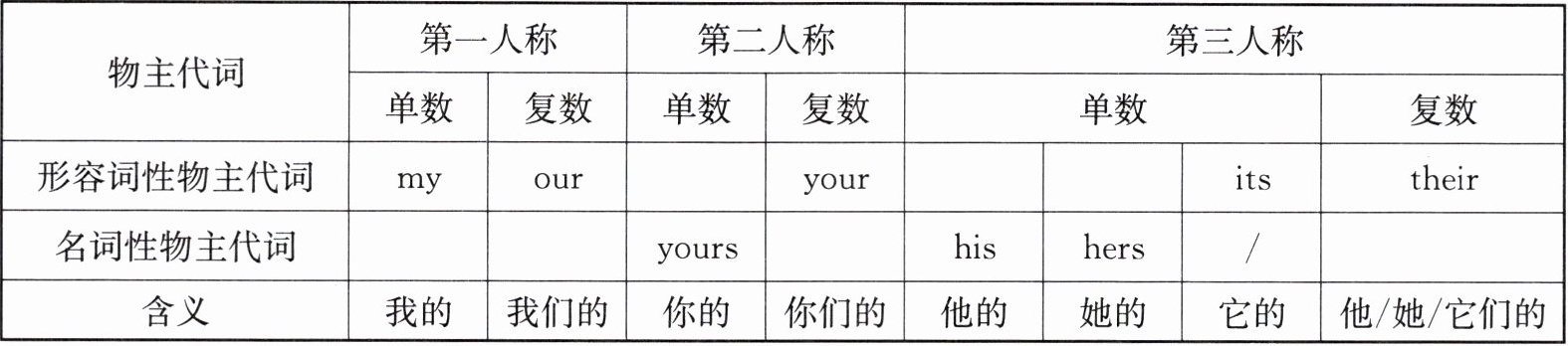 |形容词性物主代词|my|our|your|your|his|her|its|their|