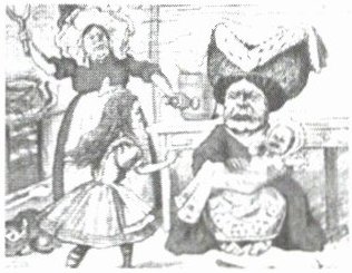 她发现自己在一个厨房里,里面烟雾弥漫。炉火旁有个非常生气的厨师,房间中央坐着公爵夫人,怀里抱着一个尖叫的婴儿。每隔几分钟,就有一个盘子掉到地上。还有一只大猫,正坐在椅子上咧着嘴笑。