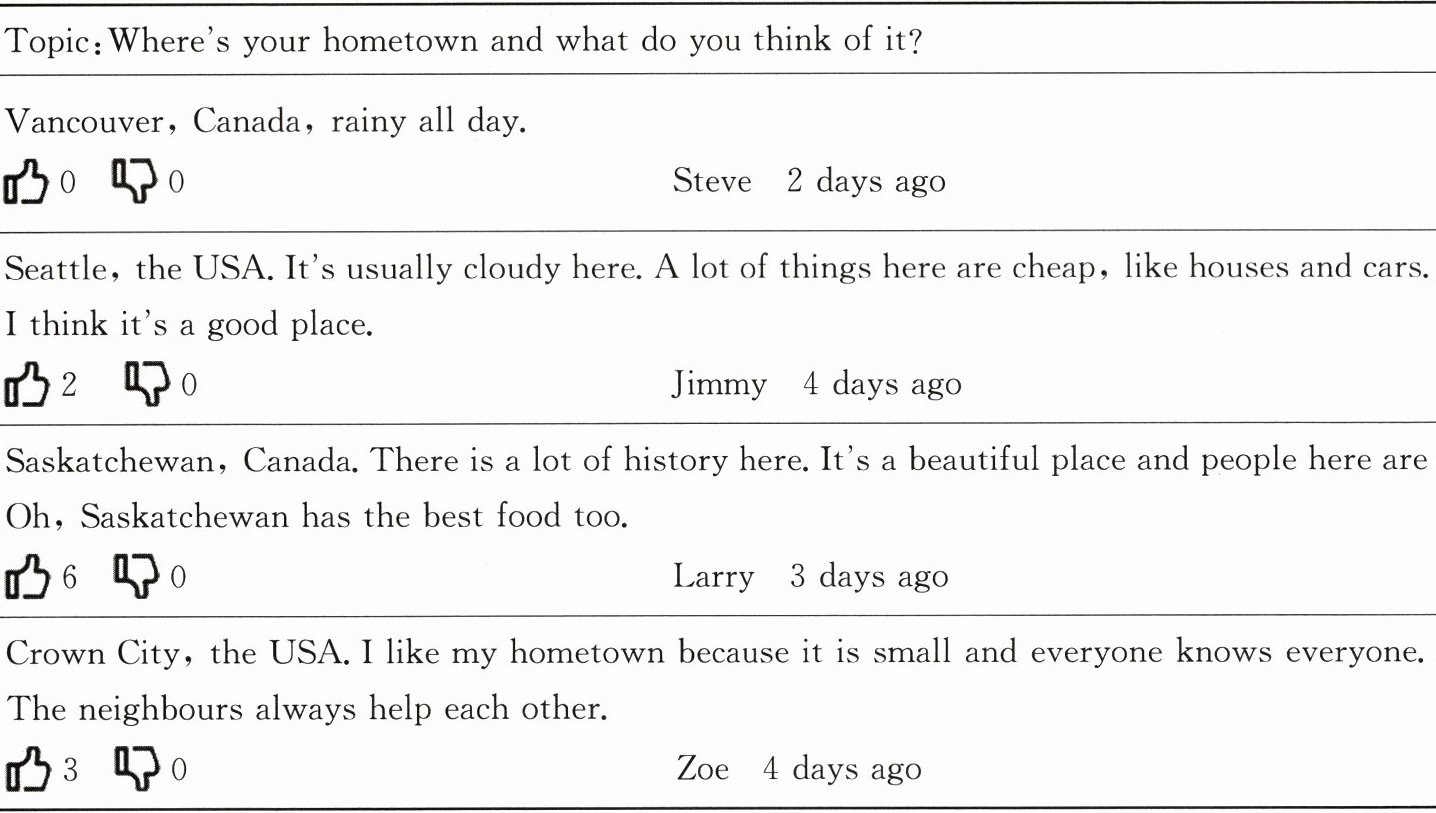 3. B 【点拨】综合全文可知,本文包含用户名称(Steve、Jimmy等)、发布时间(2 days ago、4 days ago等)以及点赞手势,这些都是典型的网络留言形式;因此,本文最可能出现在互联网上。故选B。
